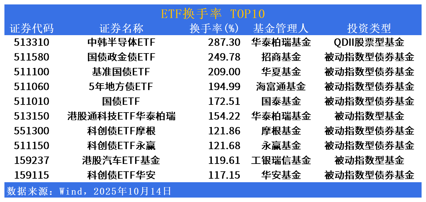 换手率方面,中韩半导体ETF(513310)换手率居首,达287%。国债政金债ETF(511580)、基准国债ETF(511100)、5年地方债ETF(511060)换手率居前。