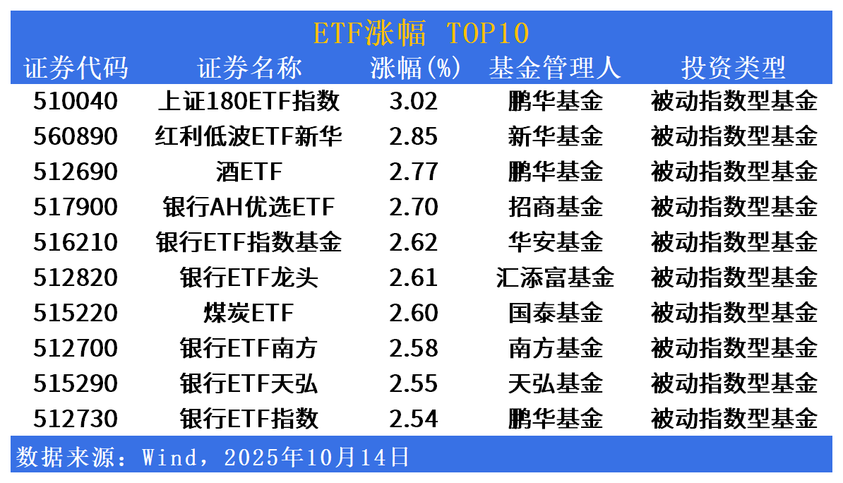 涨幅方面,上证180ETF指数(510040)涨超3%