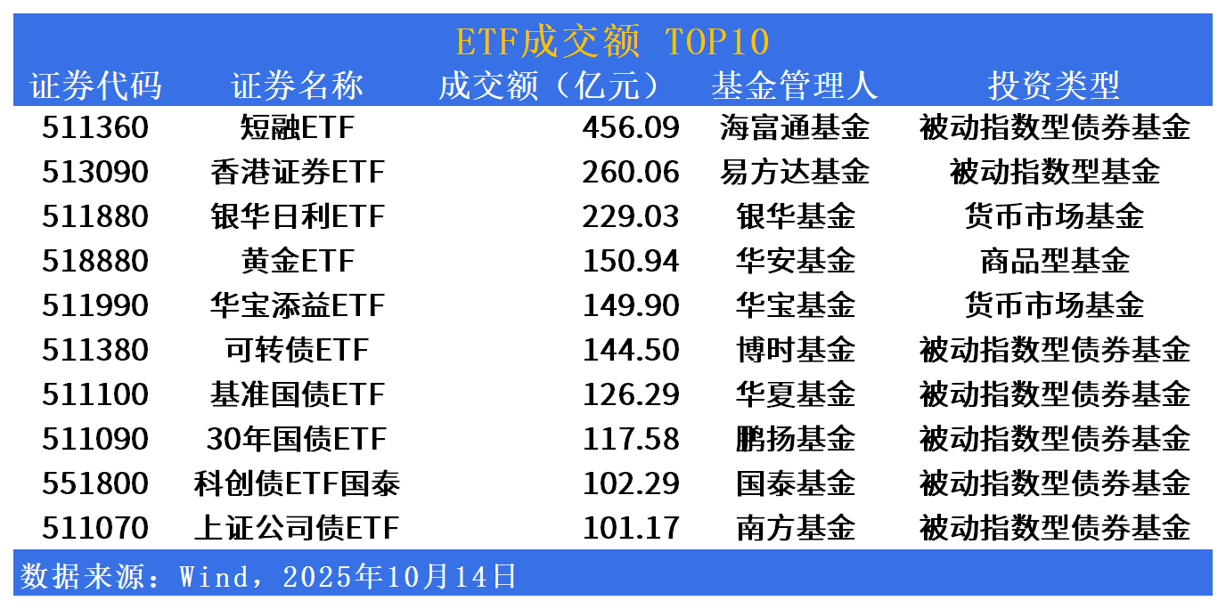 成交额方面,短融ETF(511360)今日成交额居首,达456亿元;香港证券ETF(513090)、银华日利ETF(511880)、黄金ETF(518880)成交额紧随其后。